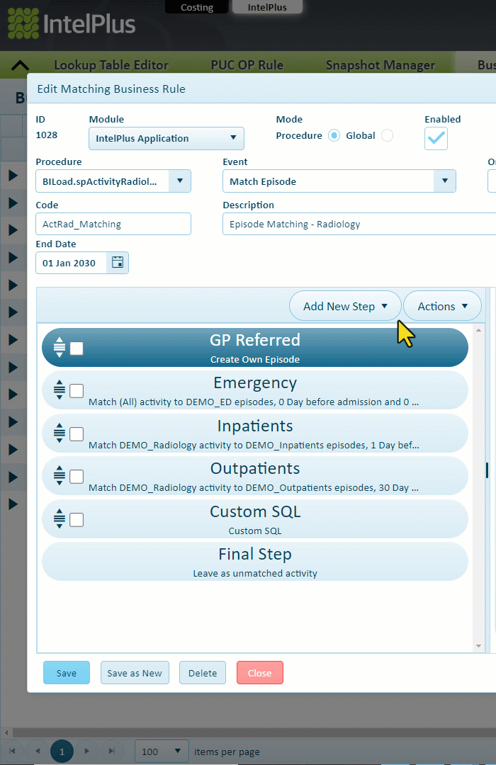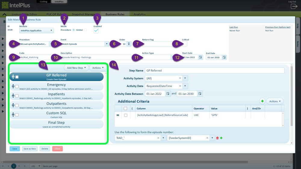 The bottom-left pane (green box above) shows the order of the steps for the matching rule. There are three types of steps you can add (Match Episode, Make Own Episode and Custom SQL), plus the final step which is mandatory.